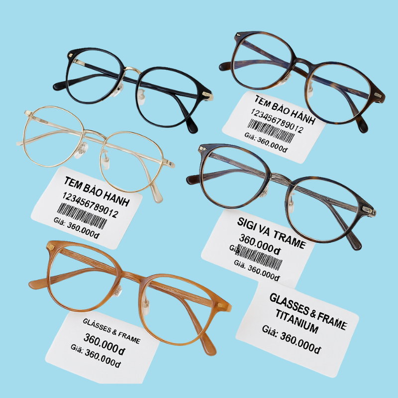 In thông tin sản phẩm, giá bán, logo thương hiệu, mã vạch, QR code cho mắt kính và hộp đựng kính |